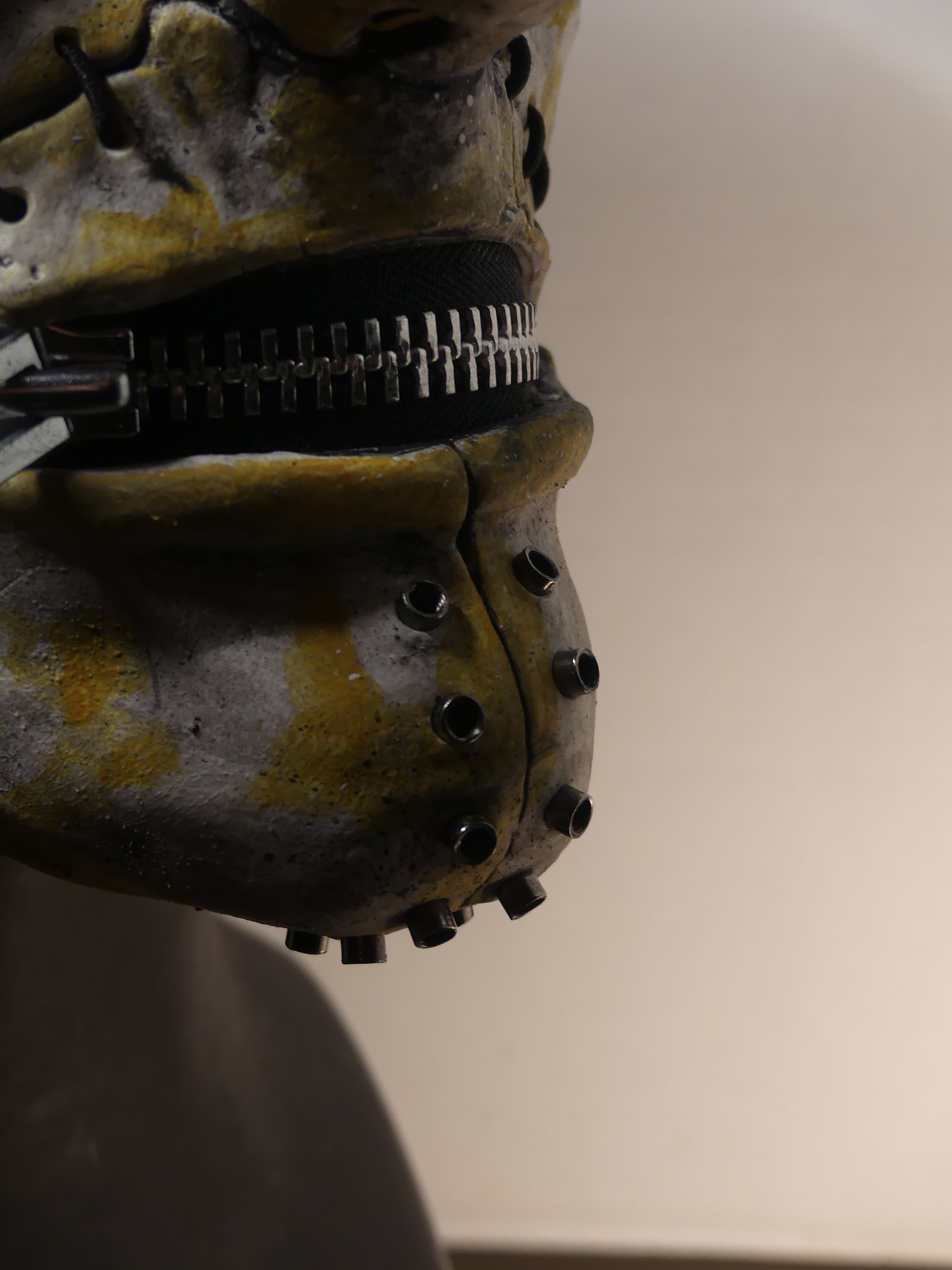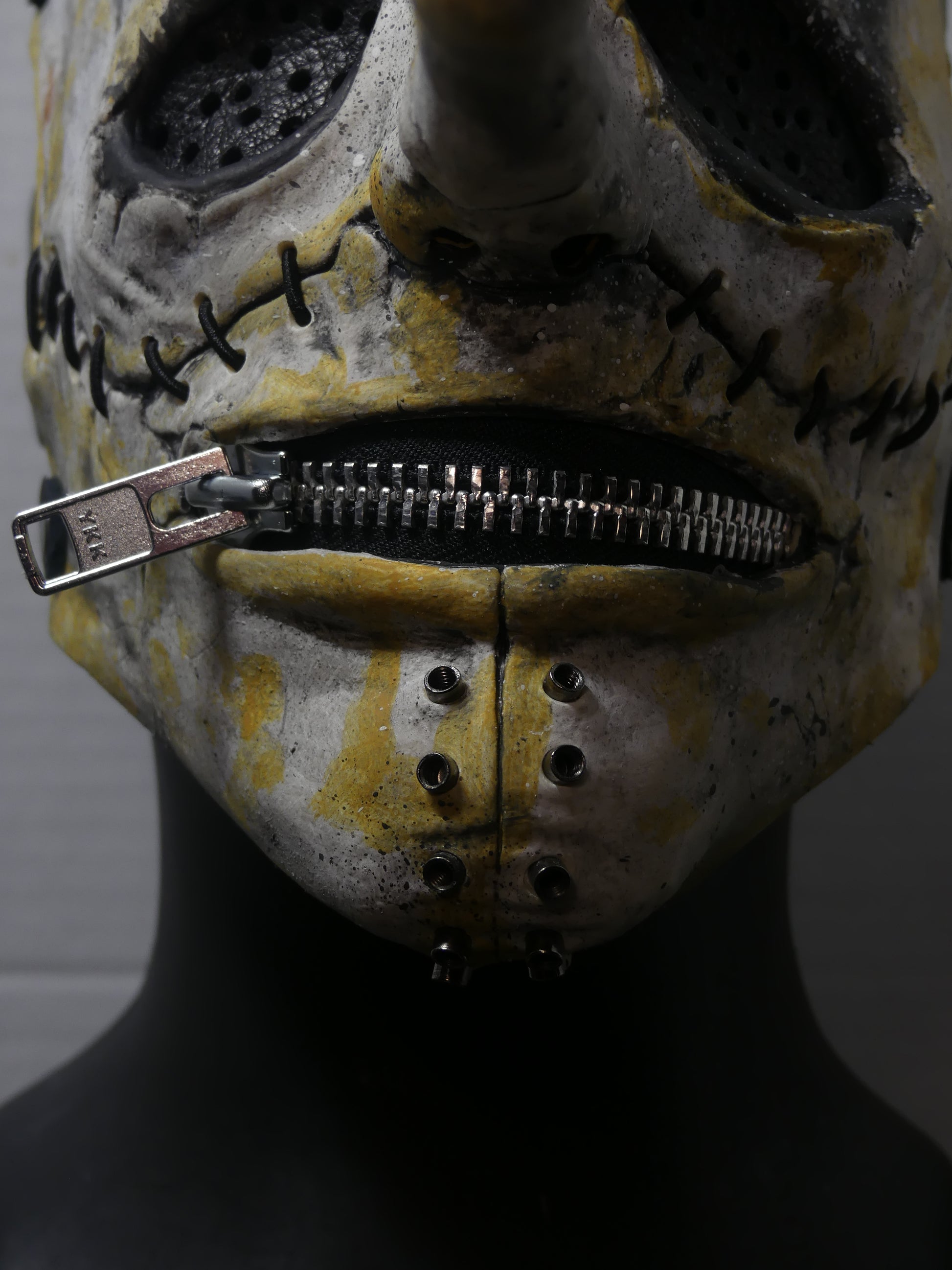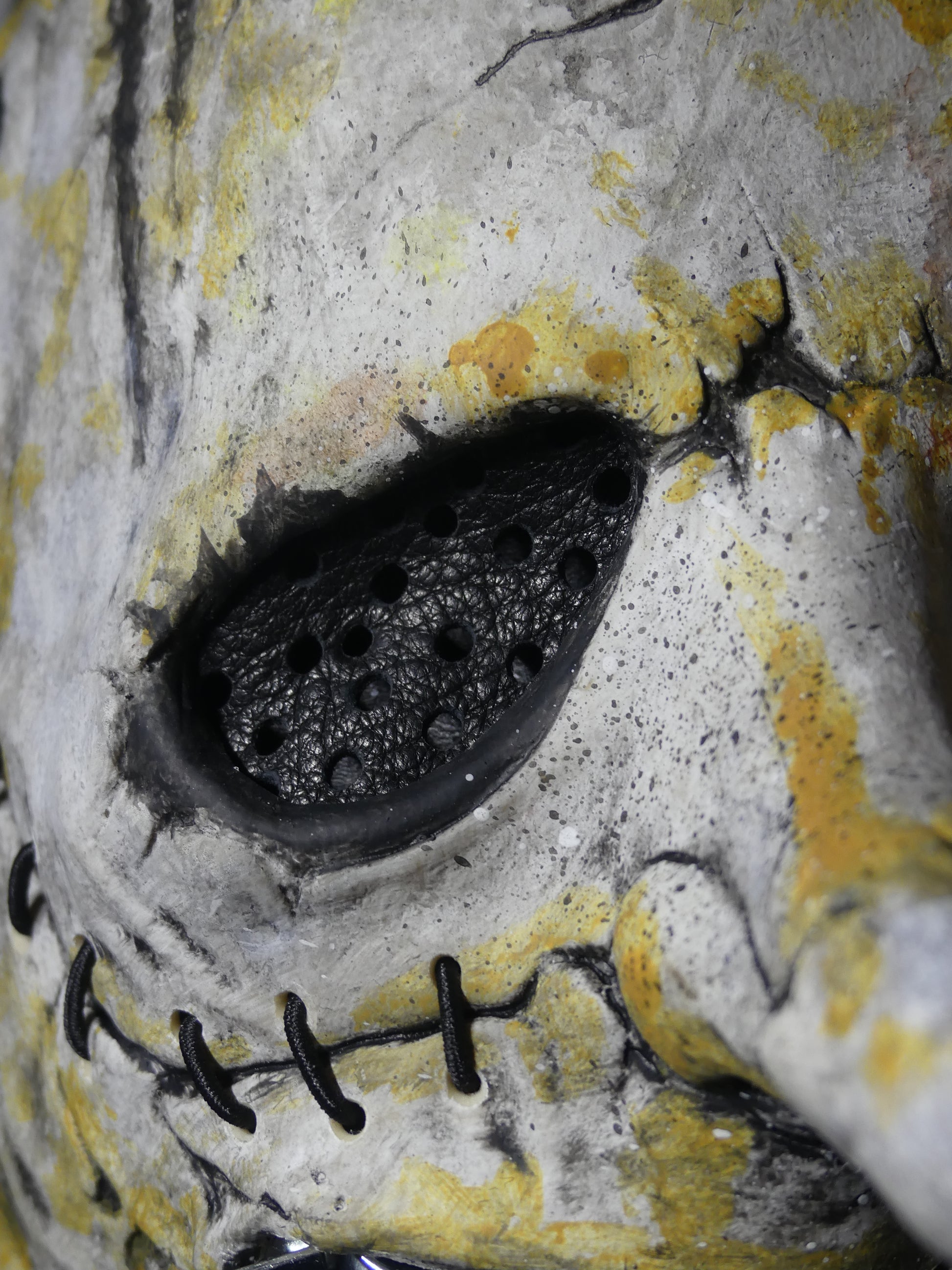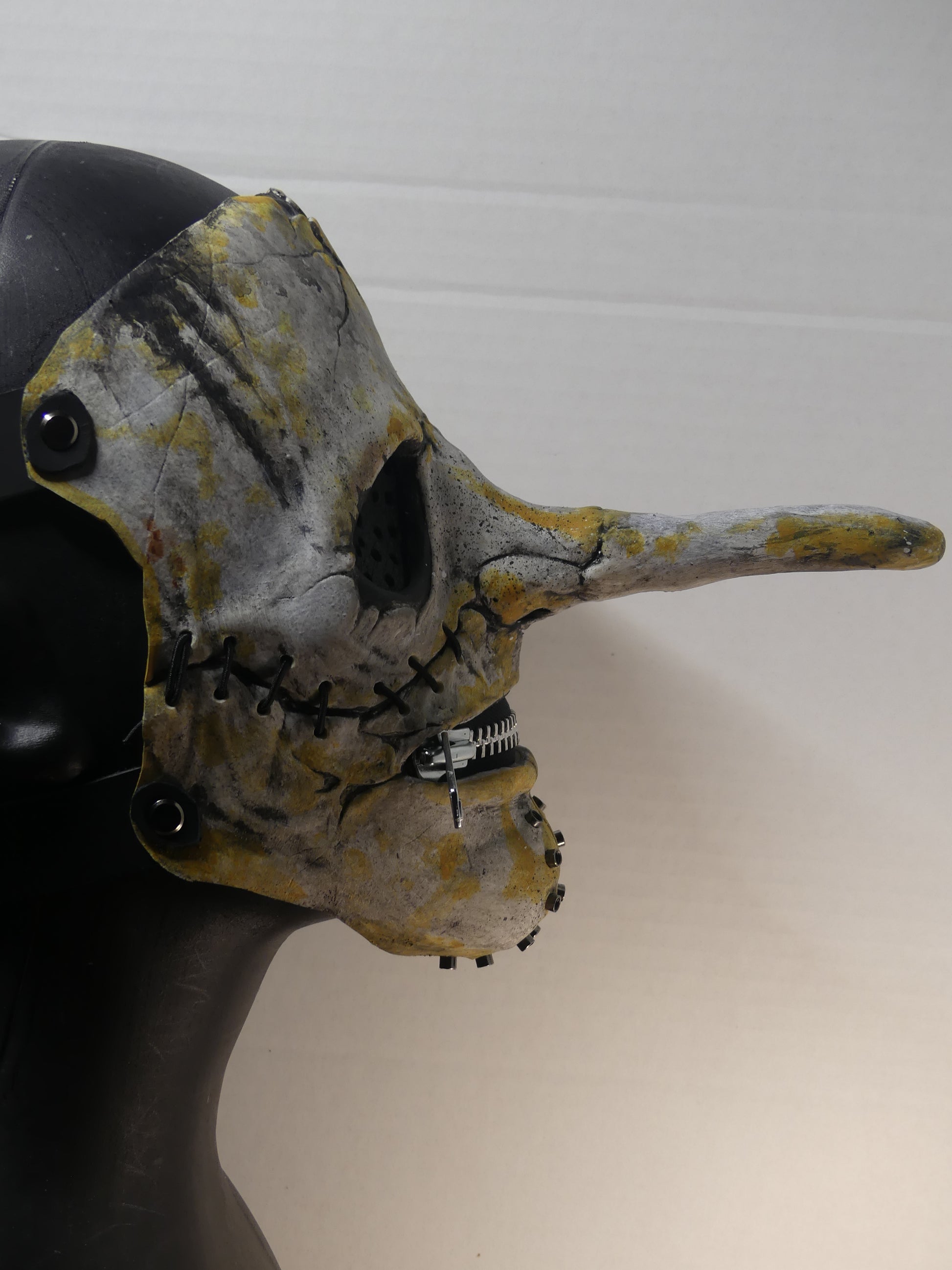 This mask is made of latex rubber and has adjustable leather straps with a functional zipper and custom leather eye "mesh". The nose is halfway filled solid with latex due to the draining process not going exactly right, but it doesn't effect anything.
