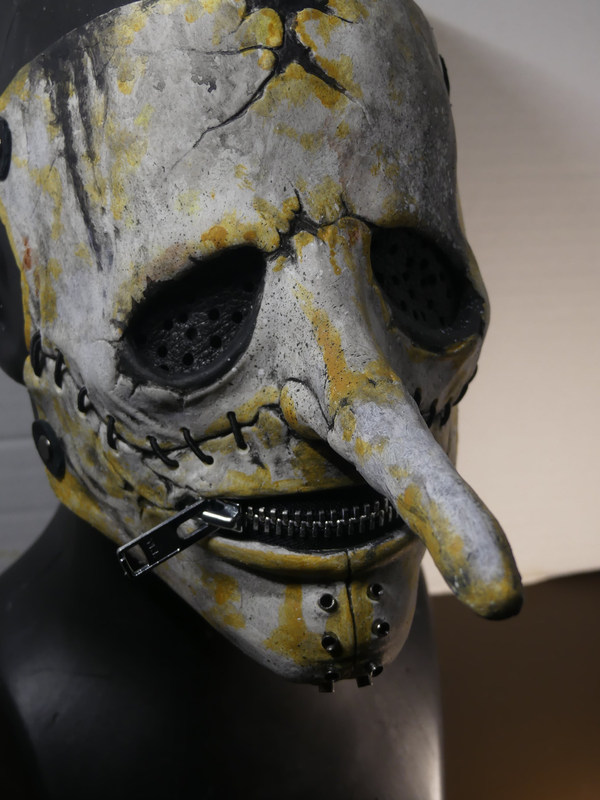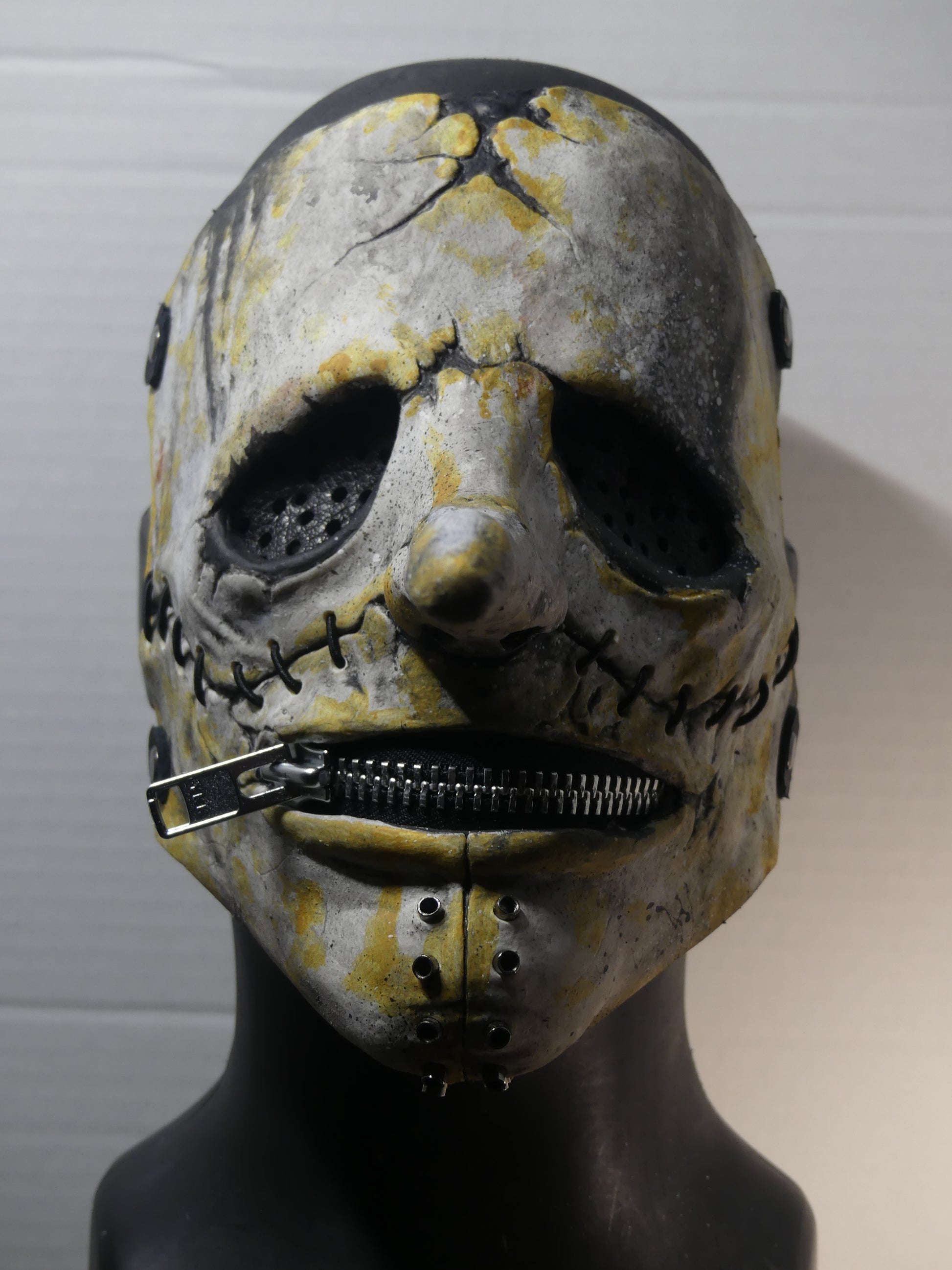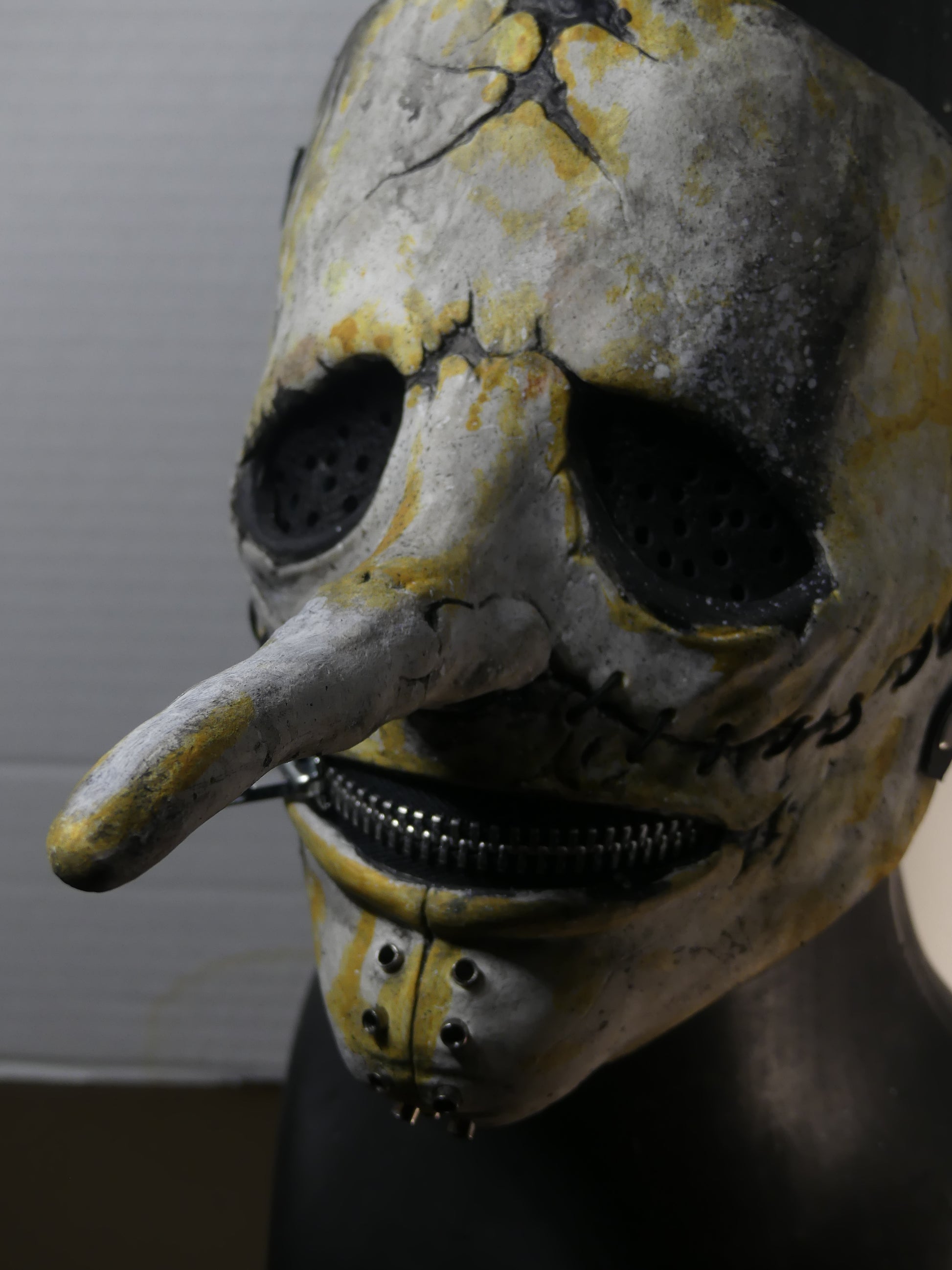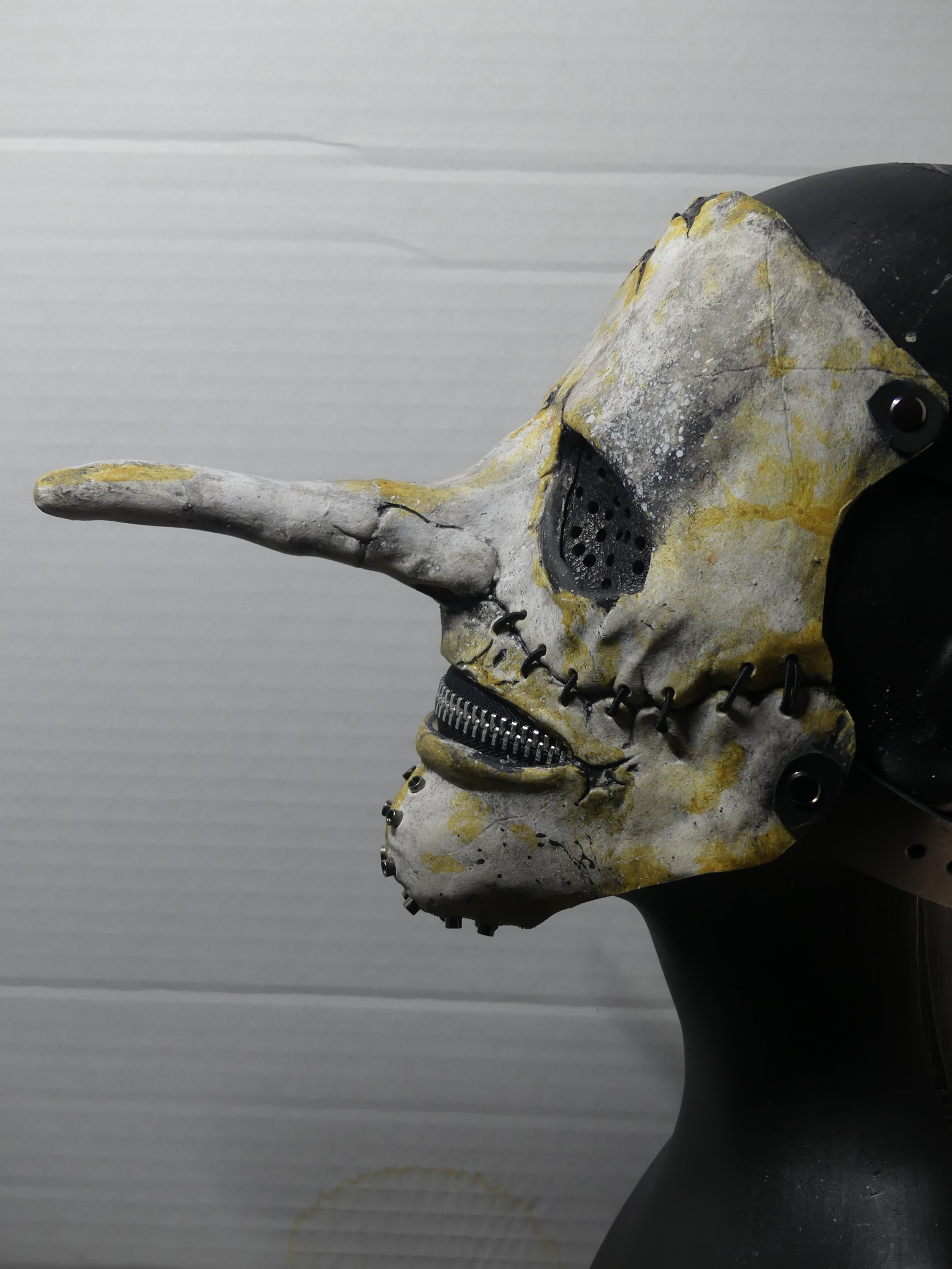 This mask is made of latex rubber and has adjustable leather straps with a functional zipper and custom leather eye "mesh". The nose is halfway filled solid with latex due to the draining process not going exactly right, but it doesn't effect anything.
