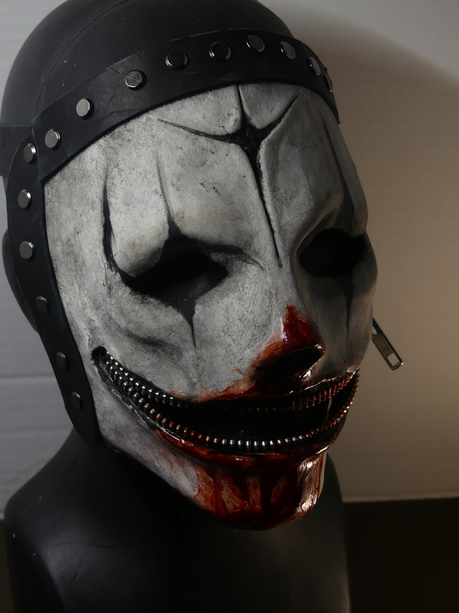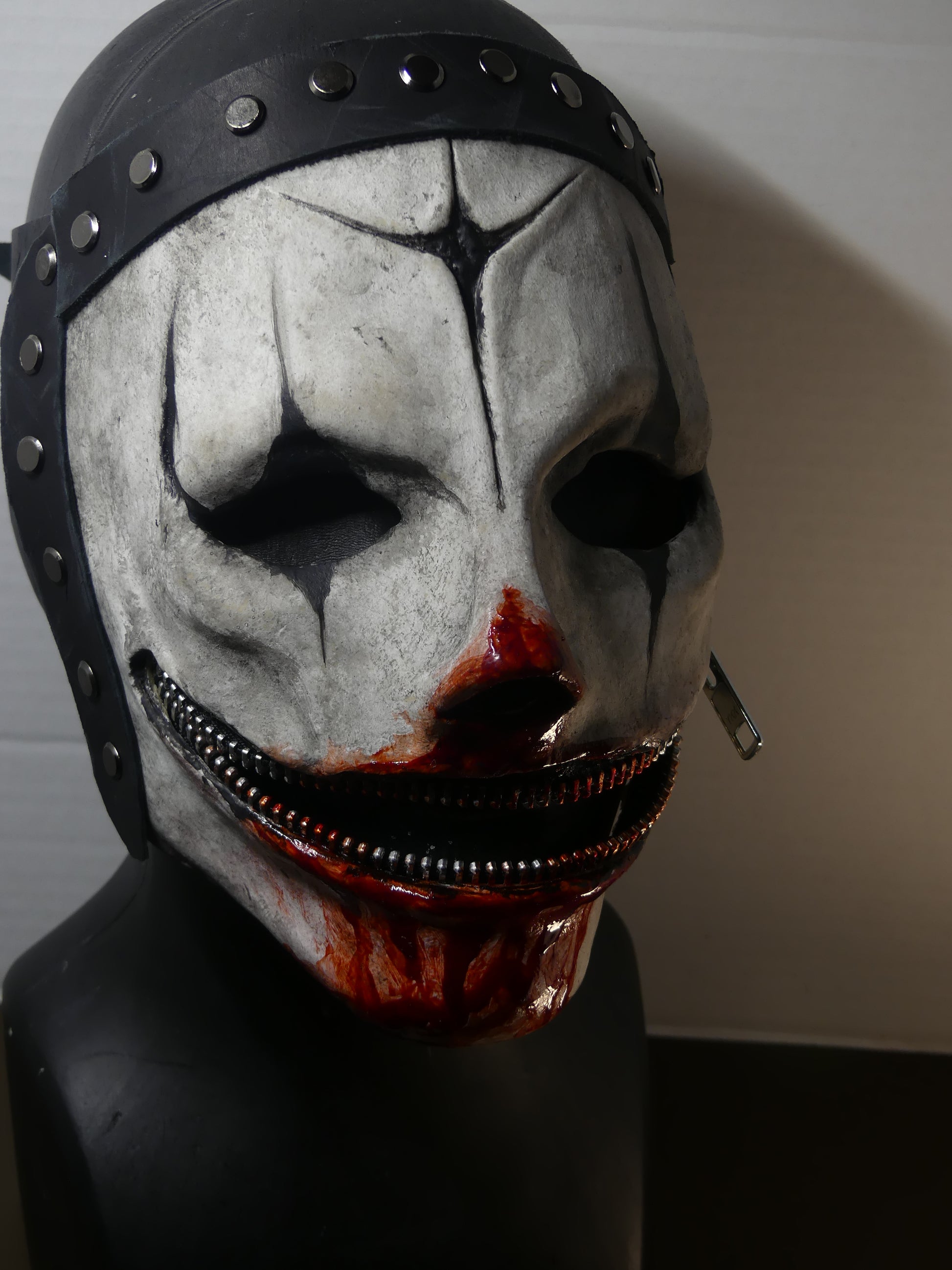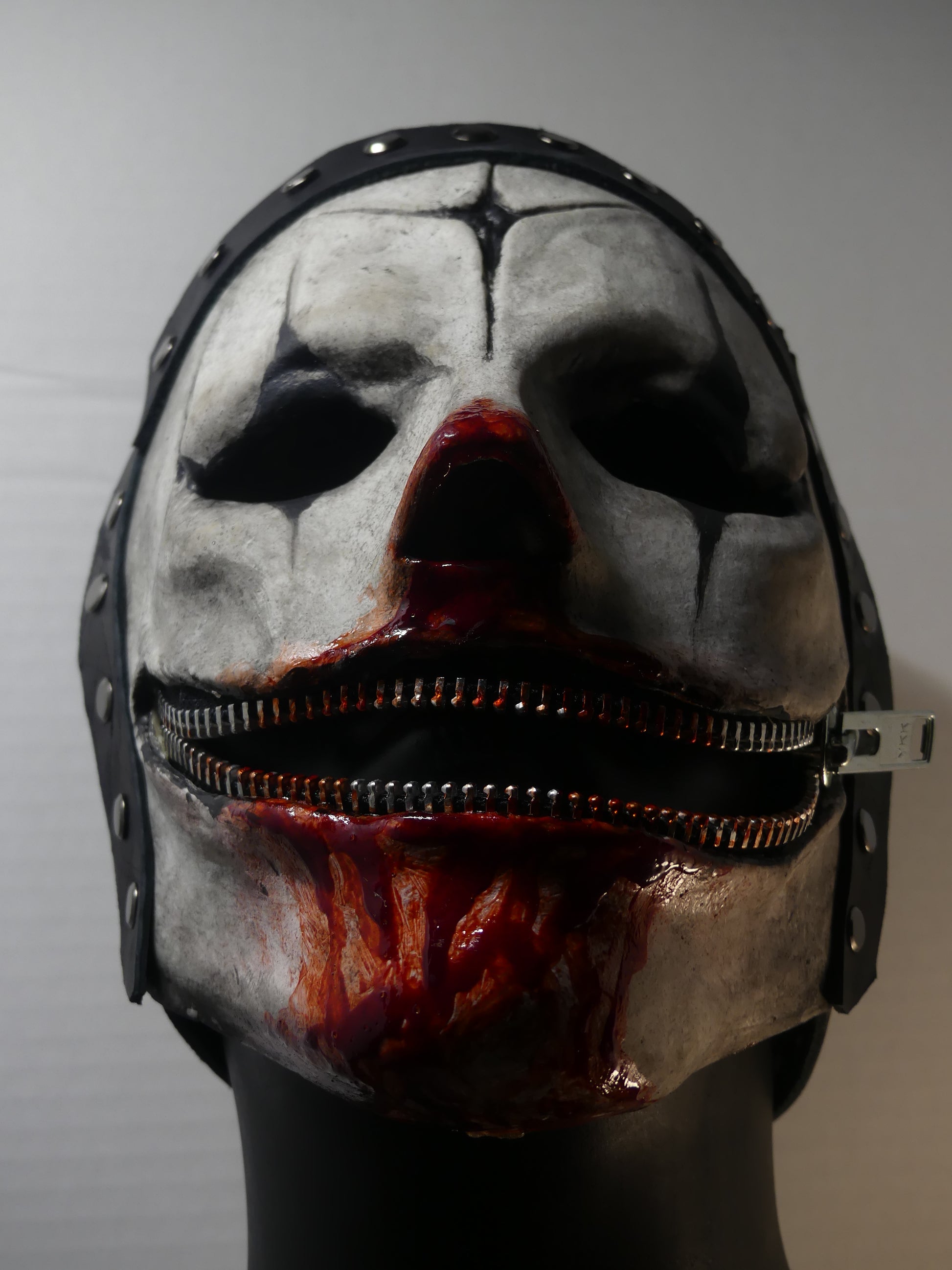 This mask is made of latex rubber and has adjustable leather straps. The zipper is not functional, so please don't attempt to zip it up.
