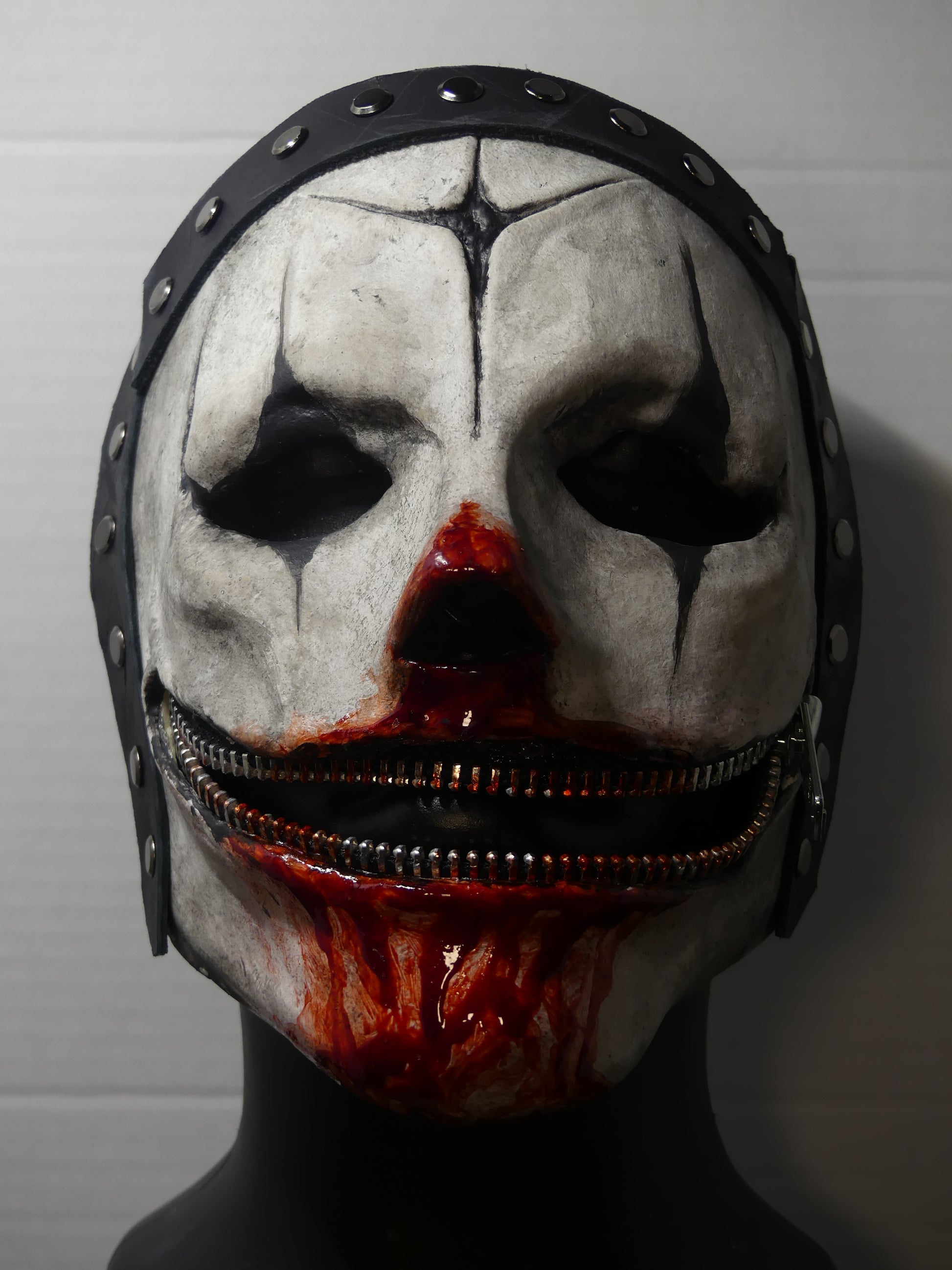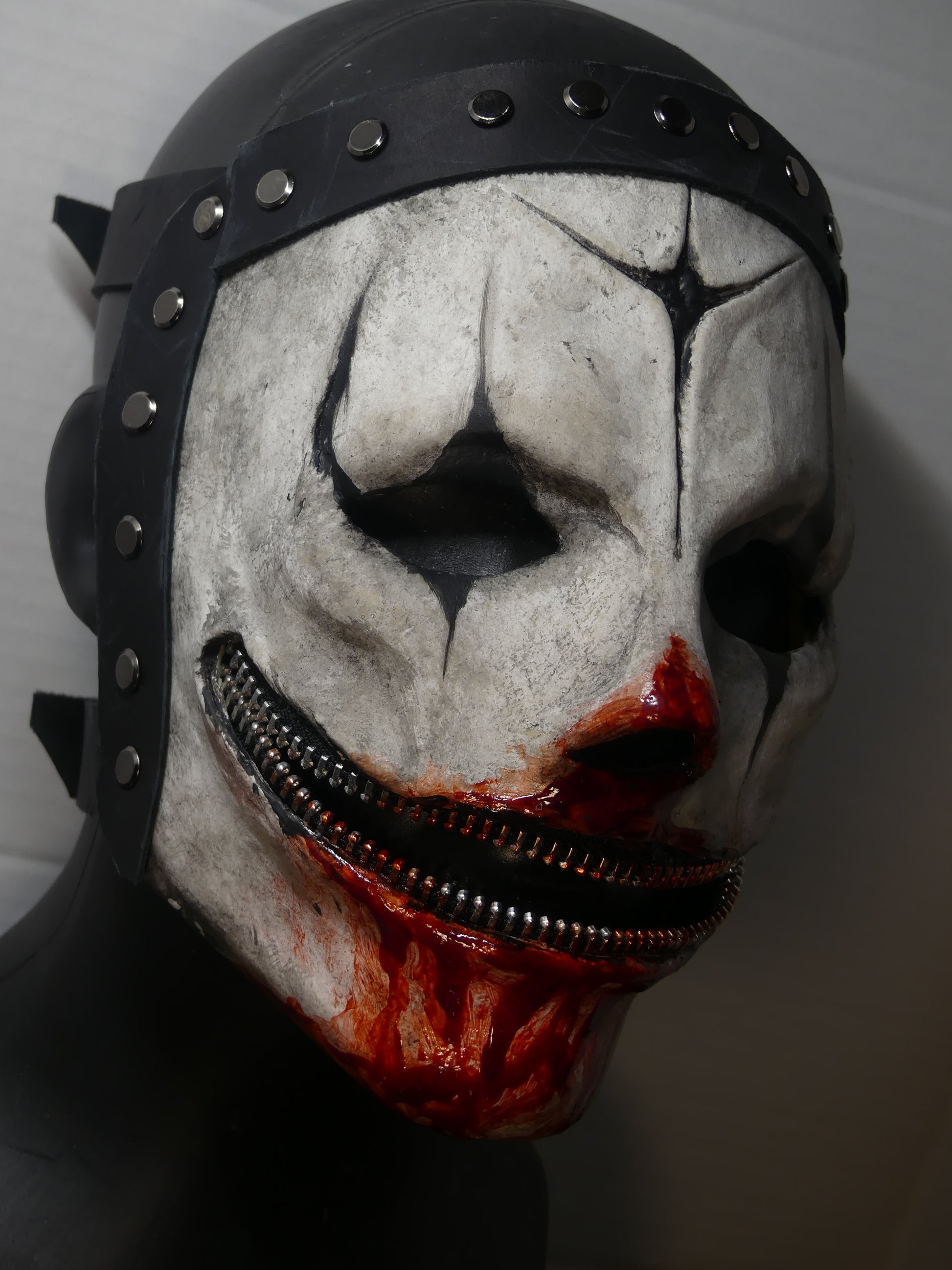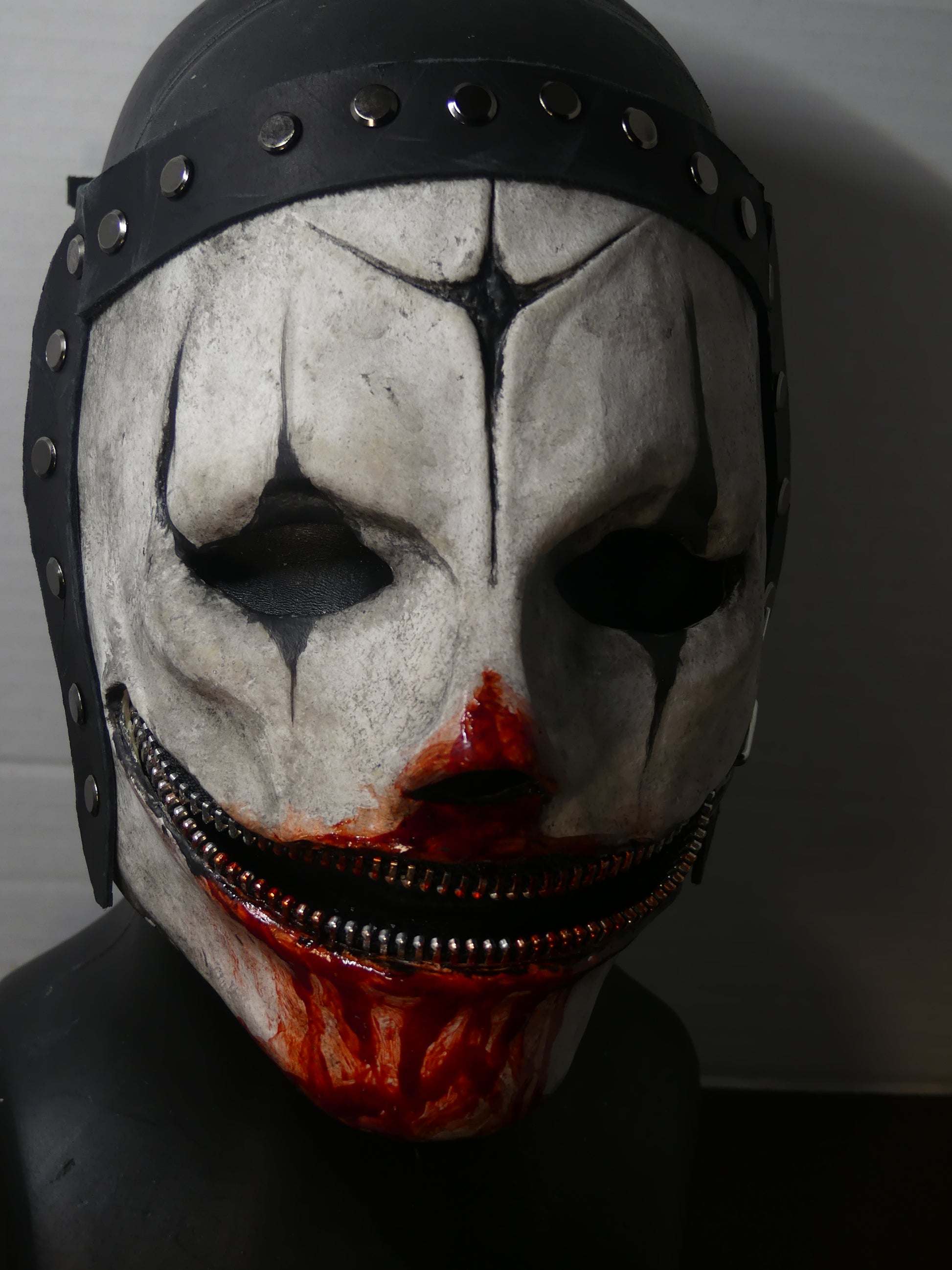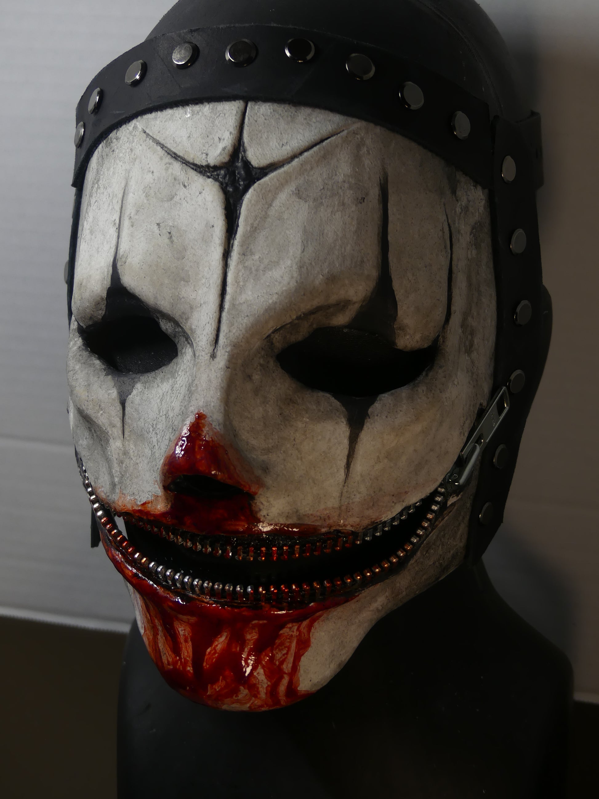 This mask is made of latex rubber and has adjustable leather straps. The zipper is not functional, so please don't attempt to zip it up.