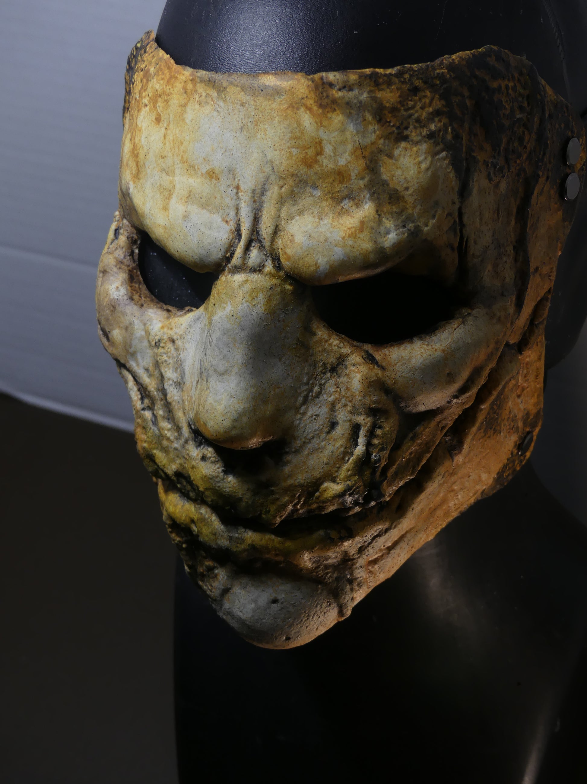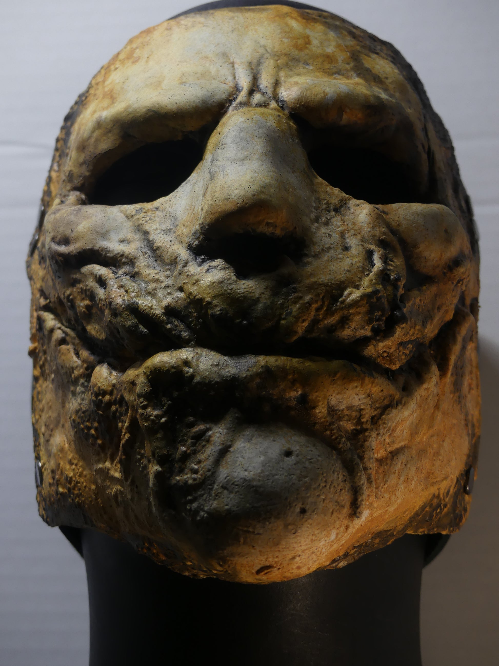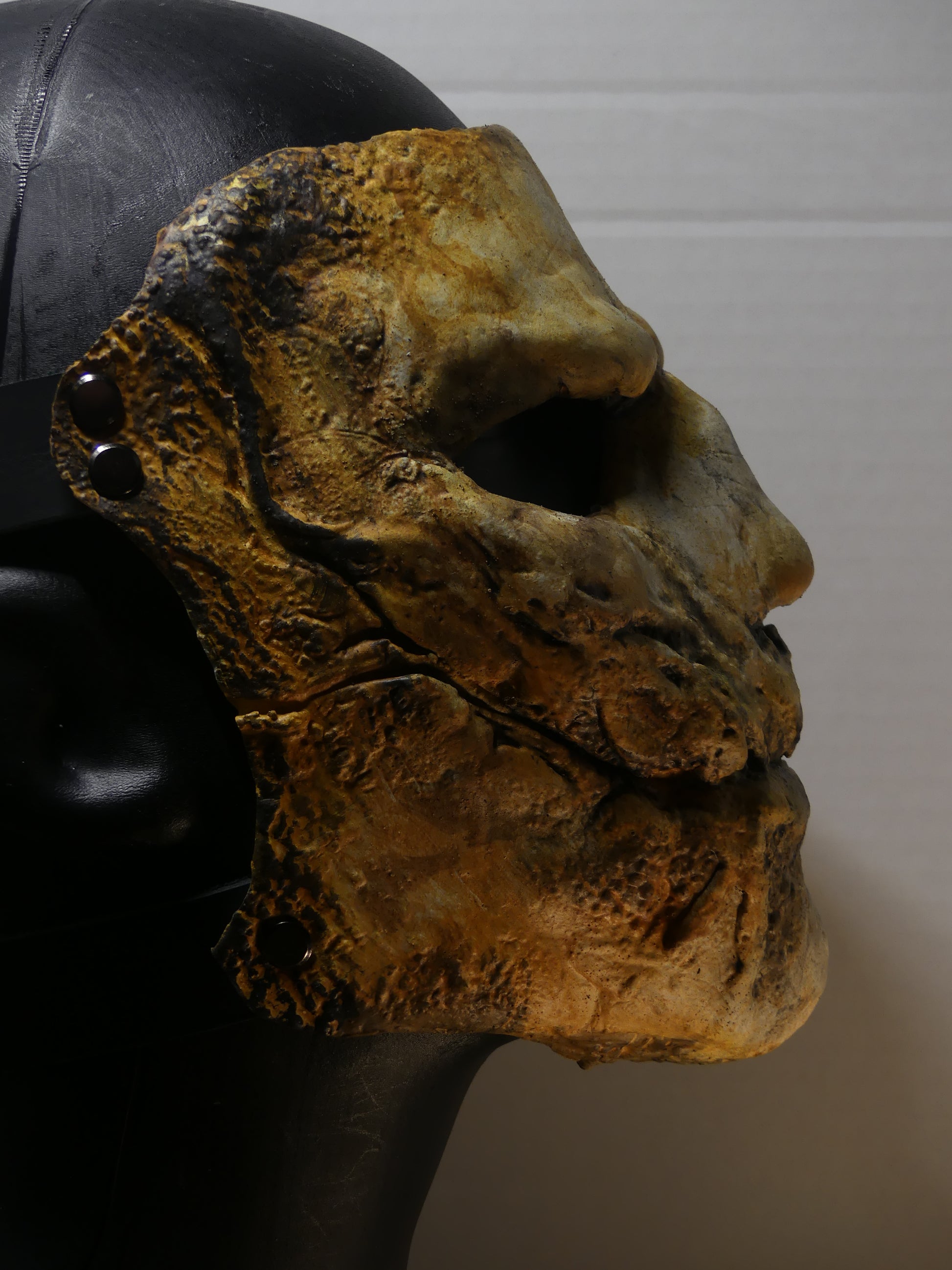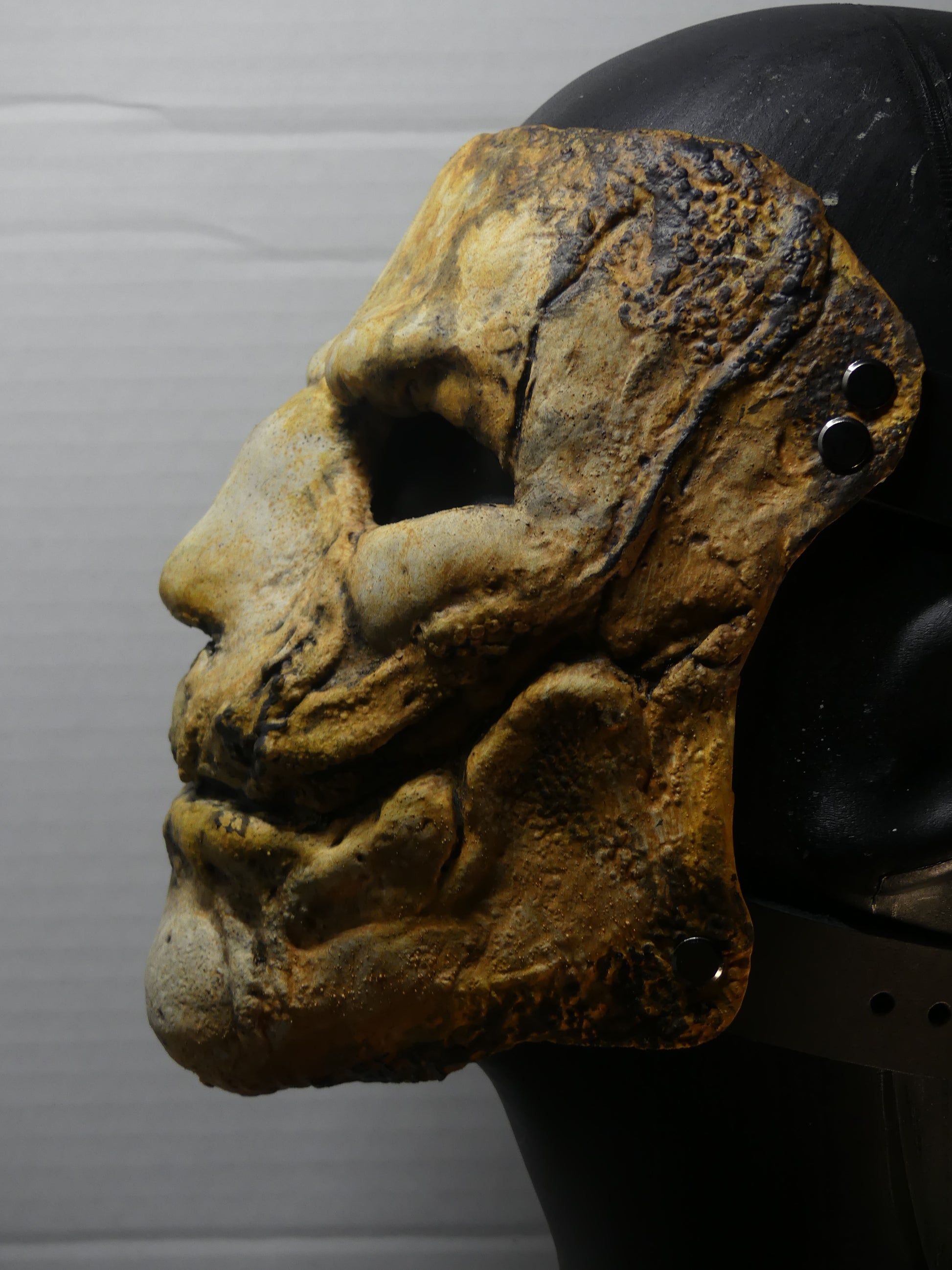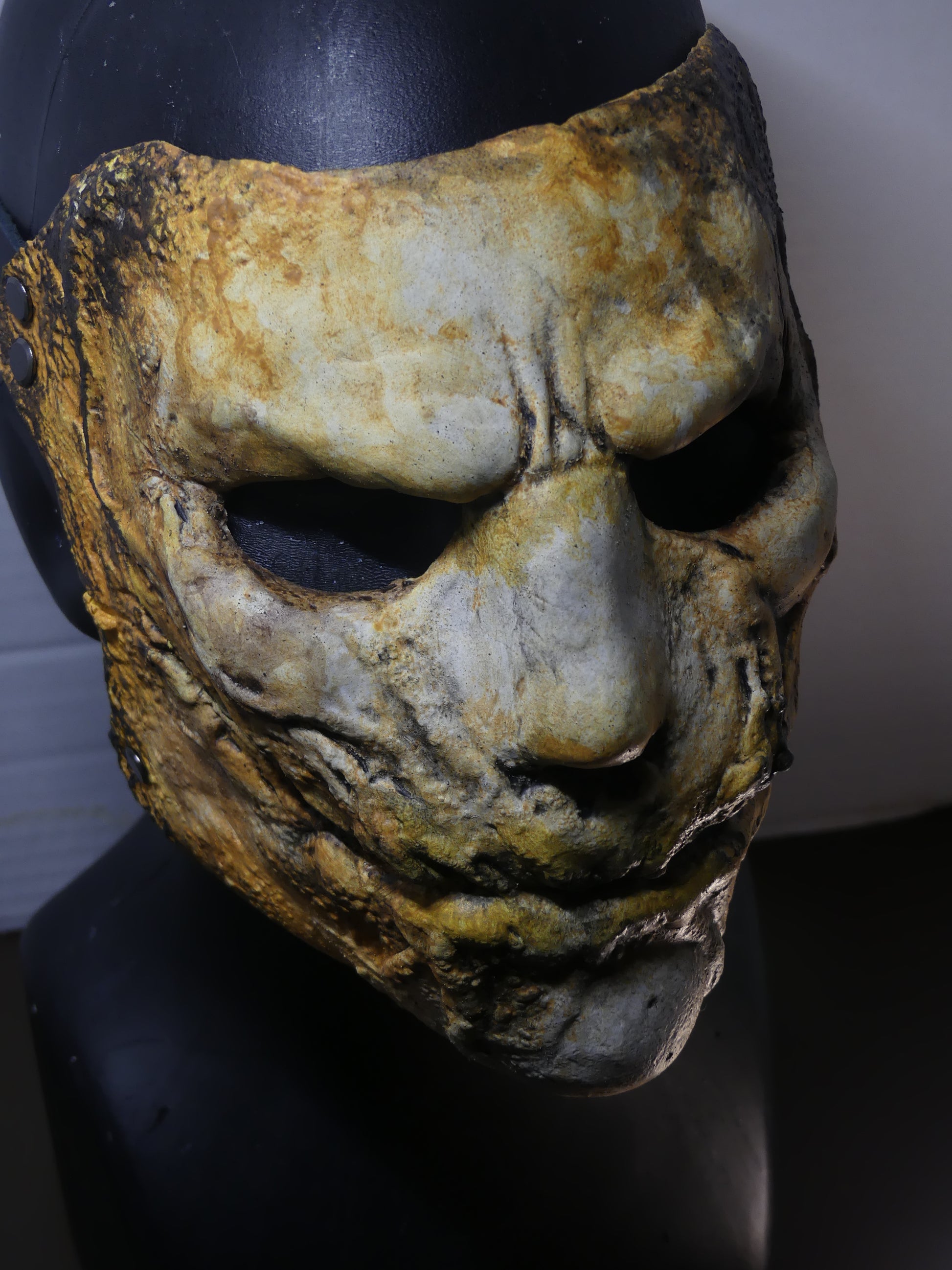 This mask is made of latex rubber and has adjustable leather straps.